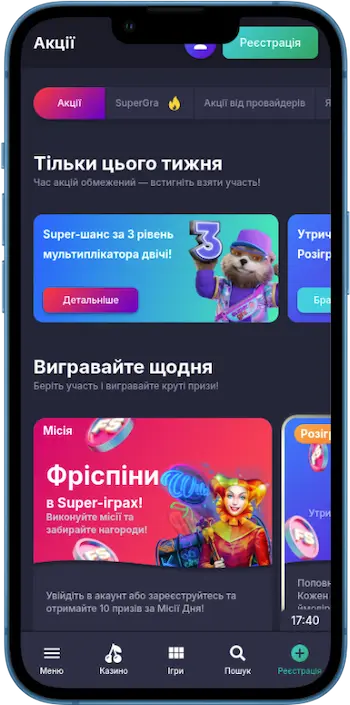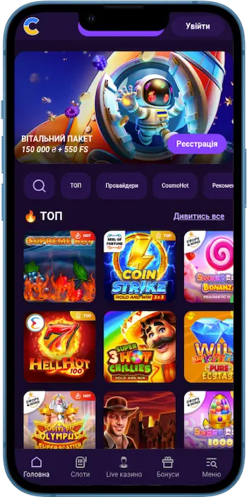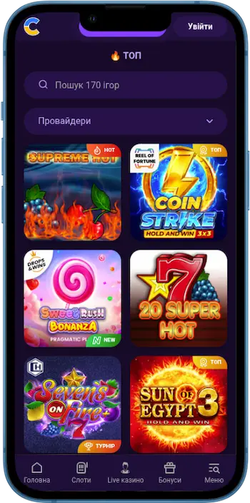 Каталог ігор містить слоти, live‑столи, crash-ігри та експрес‑режими. Провайдери — міжнародні лідери. Казино на гривні підтримує гнучкі ліміти.