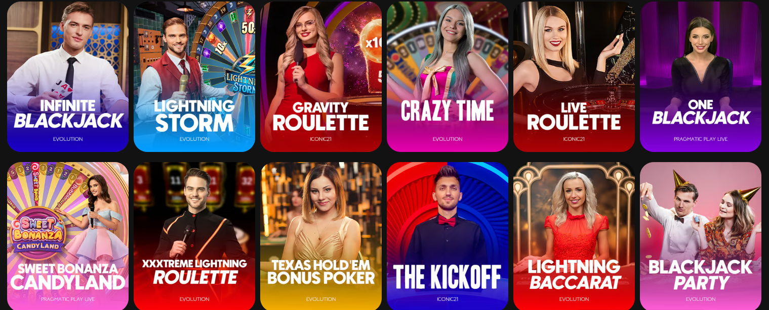Thể loại game này xuất hiện ở mọi Casino trực tuyến và thu hút được rất nhiều người chơi tham gia cá cược. Đây là thể loại game cá cược ứng dụng công nghệ Livestream hiện đại, giúp người chơi có thể đặt cược trực tiếp và giao lưu với Dealer thật. Một số tựa game Live Casino đáng trải nghiệm nhất phải kể tới:
